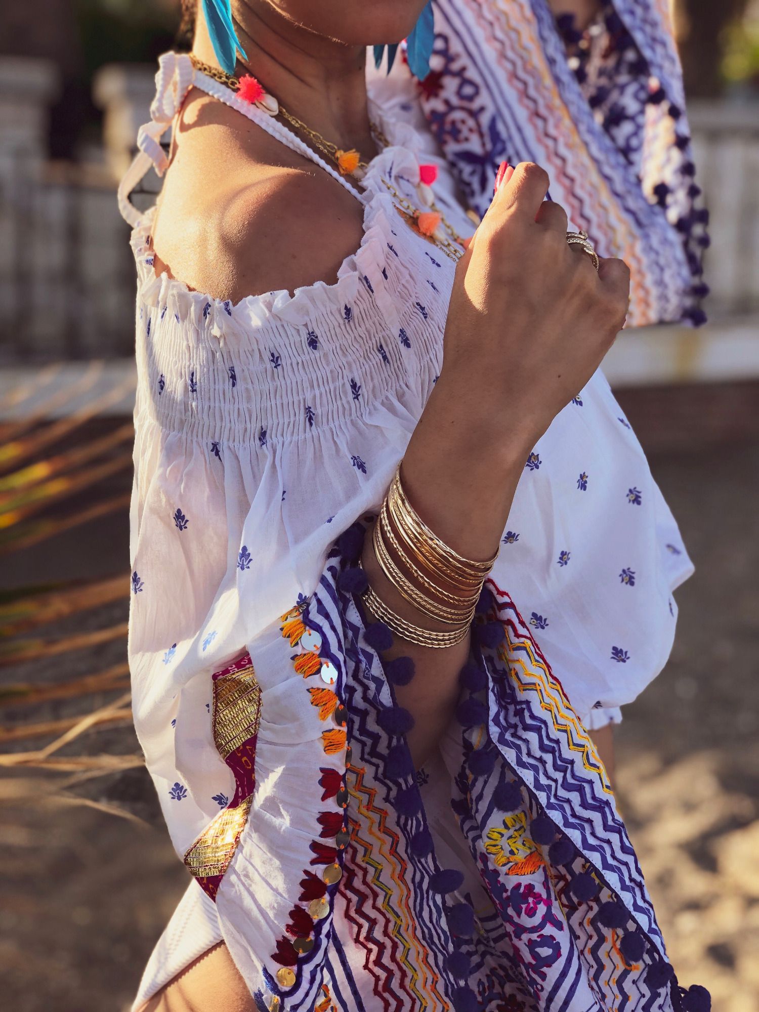Armschmuck in bunten Gewürzfarben, mit Münzen, Tasseln und Pompoms. Ein Look wie ein Souvenir aus fernen Ländern